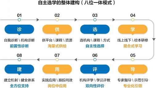 上图对自主选学培训活动的八大环节进行了功能定位与特色阐释,对其中一些环节的实施要点做出了概括性描述,如在“诊”的环节中,提出了“明诊”的“44433”办法,明确了自我、机构、综合三元诊断要求;在“供”的环节中,提出了“2+1+1”内容板块,明确了公共必修、年度必修+分层选修+开放选修四维内容结构;在“选”的环节中,建构了“四选”(选项目、选主题、选课程、选基地)“六式”(主题式、选课式、选班式、网络式、任务式、清单式)的选择空间;在“学”的环节中,提出了“1841”混合学习模式;在“导”的环节中,提出了“双导”(专家指导、示范引导)并进的导学策略;在“评”的环节中,提出了“四真”(真选、真学、真用、真改)基础上的“双评”(训中过程评价、训后改善评价)实施要点;在“用”环节中,提出了“四步递进”(训后跟踪学员成长、反观自主选学效果、强化成果实践应用、推广选学模式经验)应用指导策略;在“建”的环节中,提出了重制度、重机制建设等,为自主选学全方位体系制度建设积累了丰富素材。八大环节及其实施要点,为自主选学提供了规范化流程。