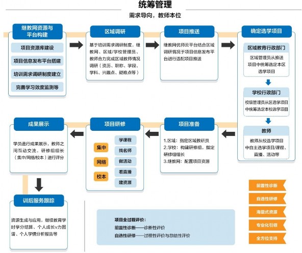 关于实施流程的探索问题。遴选部分具有积极性和基础条件的区县开展教师自主选学试点,构建起“教师申报、能力诊断、菜单选课、教师选学、校本研修、应用实践、考核评价”于一体的选学流程,教师按需选项目、选机构、选课程、选方式。